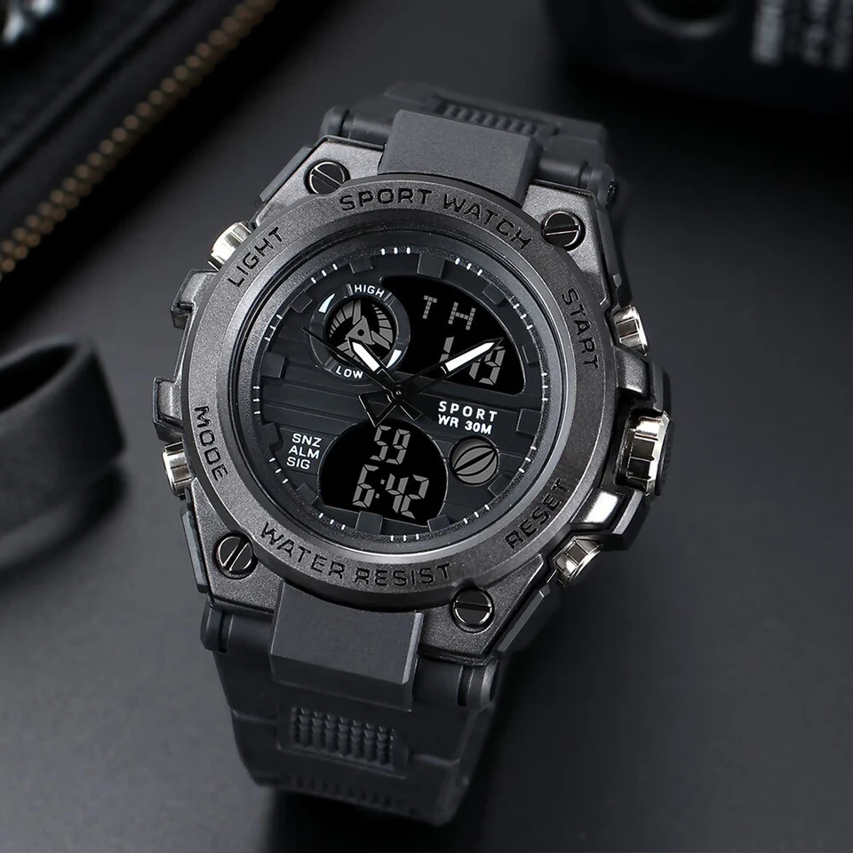 ACHENGY 청소년 스포츠 디지털 시계 남성용, 충격 방지 방수 듀얼 손목시계, LED 알람 시계, 멋진 보그 시계
